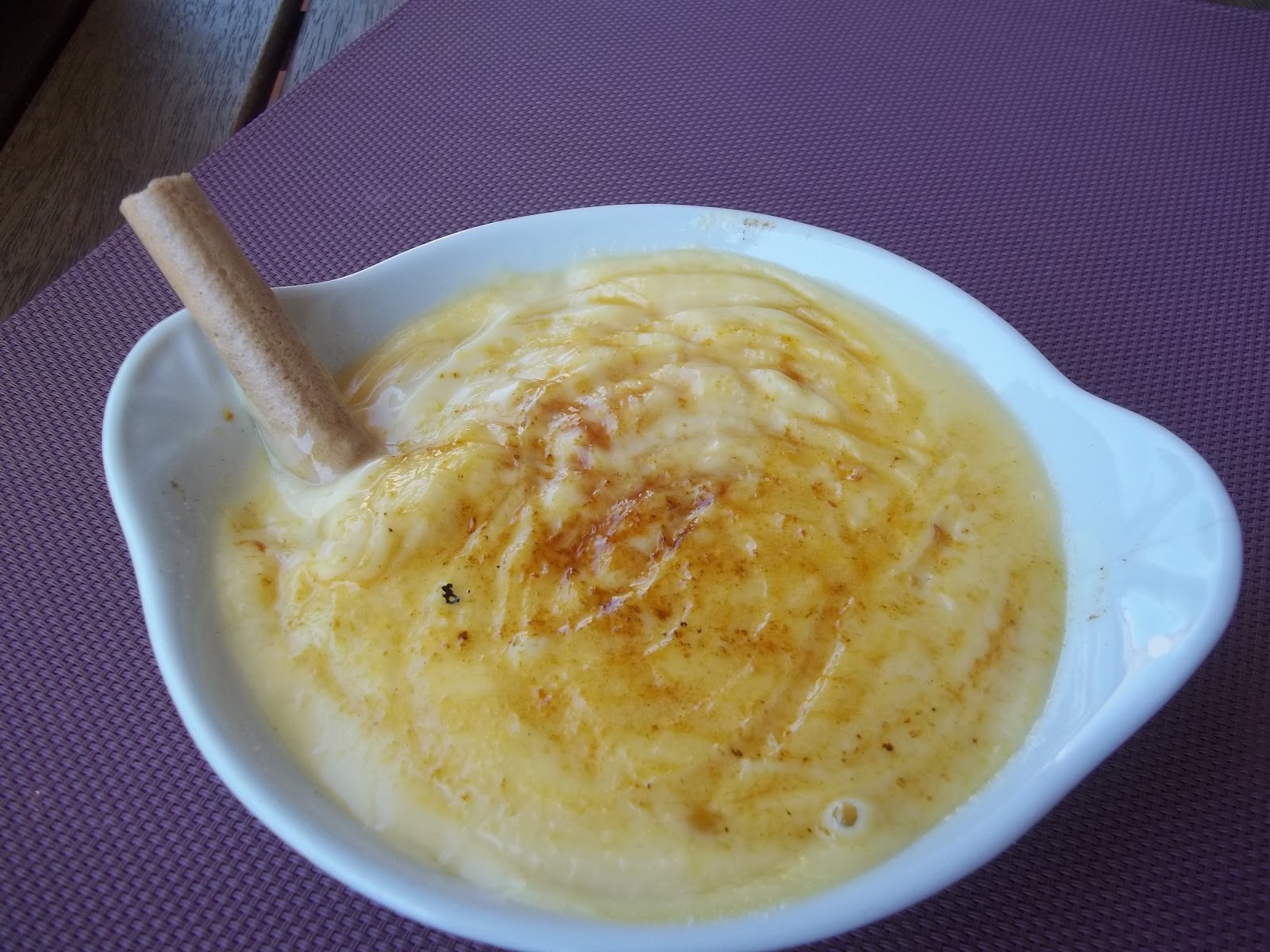 Pelar la pinya, tallar-la a trossos i repartir-la en platets. Abocar-hi la crema al damunt, posar-hi el sucre i cremar-ho.